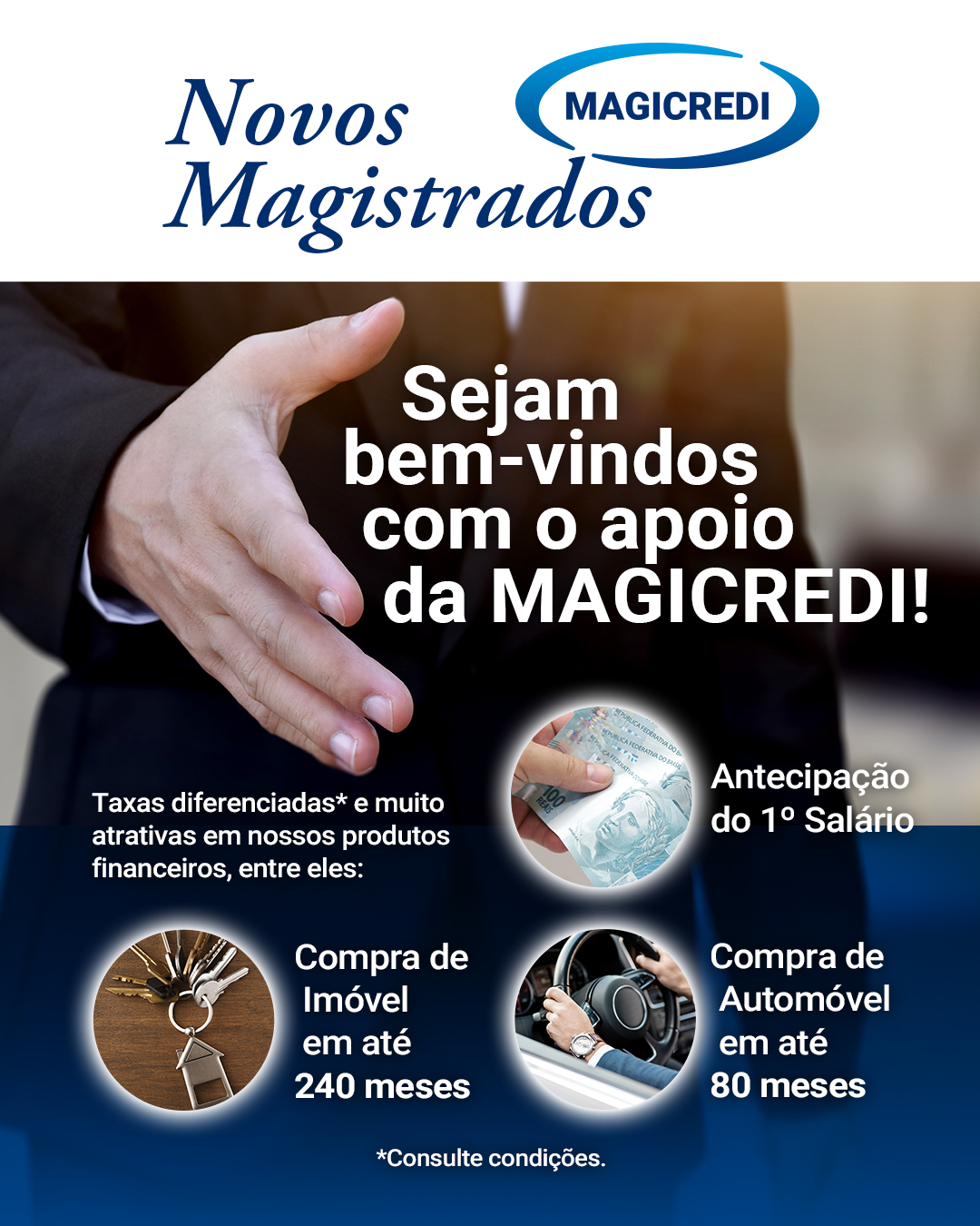 Aqui na MAGICREDI os novos Magistrados são recebidos com taxas diferenciadas* e muito atrativas em nossos produtos financeiros, entre eles: